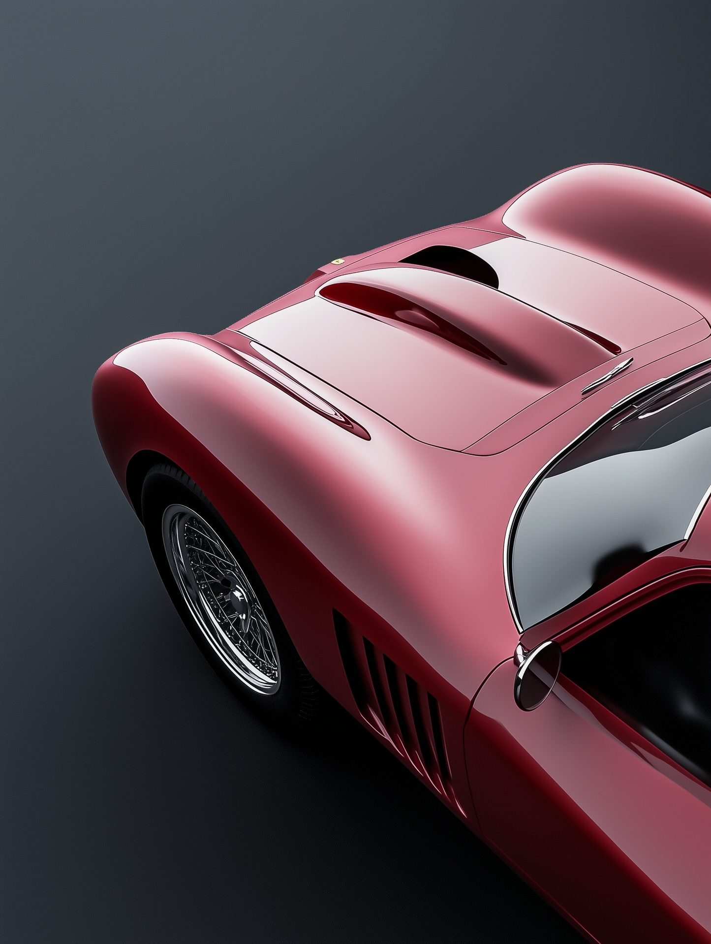 Vue du dessus, cette icône automobile semble flotter entre classicisme et modernité. Son allure évoque les courses mythiques, les routes sinueuses de la Riviera et les rugissements d’un moteur prêt à bondir. C’est une vision de puissance, mais aussi de raffinement, un équilibre parfait entre l’ingénierie et l’émotion.
